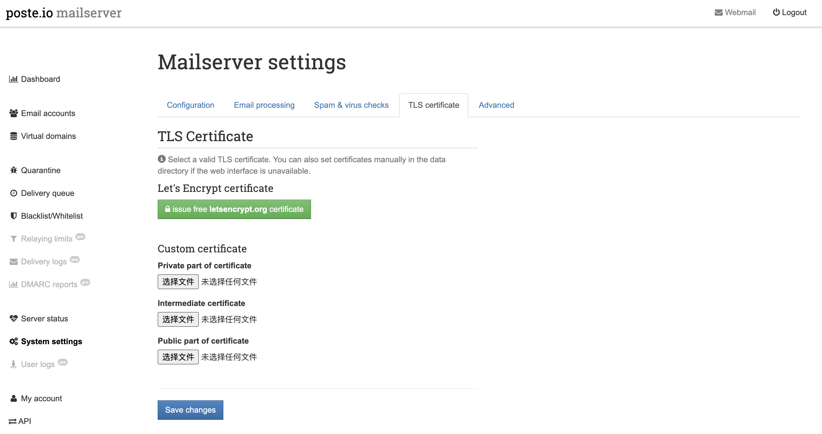 - 1panel申请下来的证书是两个文件,分别是fullchain.pem和privkey.pem,但是这个页面要上传三个证书文件,分别是Private part of certificate,Intermediate certificate和Public part of certificate。我们需要把fullchain.pem拆开,其中Private part of certificate对应privkey.pem,Public part of certificate对应的是fullchain.pem的上半段内容,Intermediate certificate对应的是fullchain.pem和privkey.pem的后半段内容。将这些上传至对应块,点击 Save chanages生效。