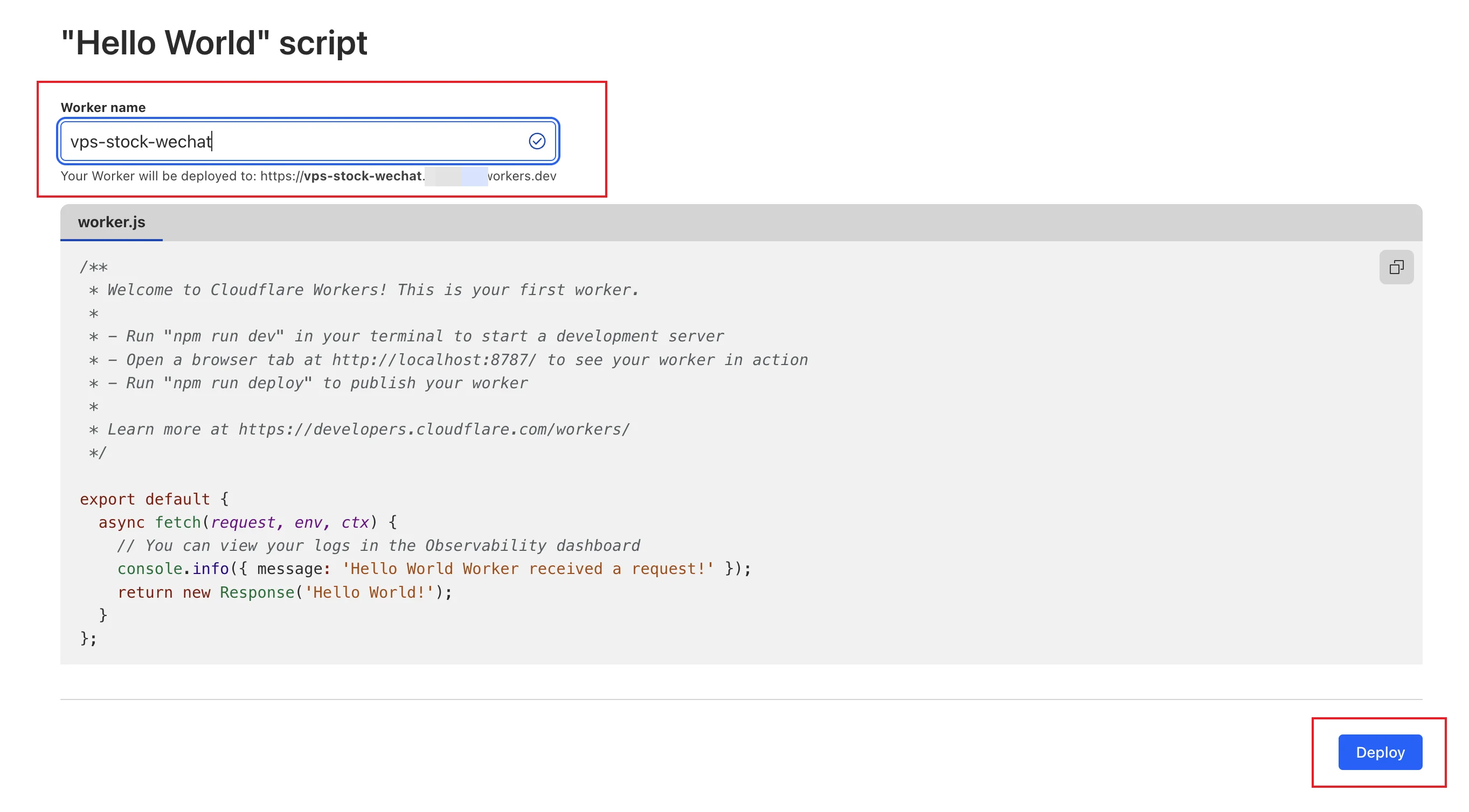 取一个 Worker name, 例如: "VPS 补货微信通知",然后点击右下角 Deploy