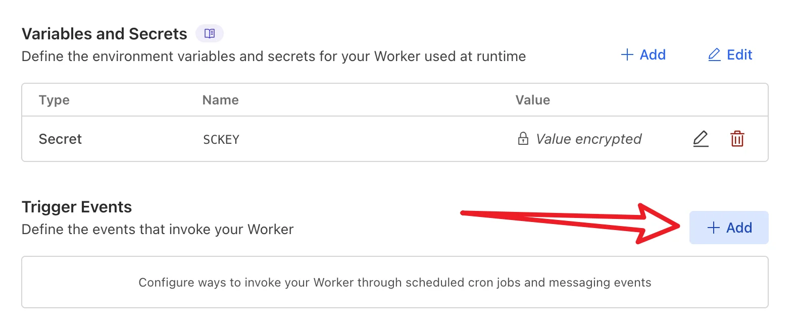 点击 Add 之后,环境变量类型选择 Secret,Variable name 填写 SCKEY,Value 填你的 Server 酱 Token