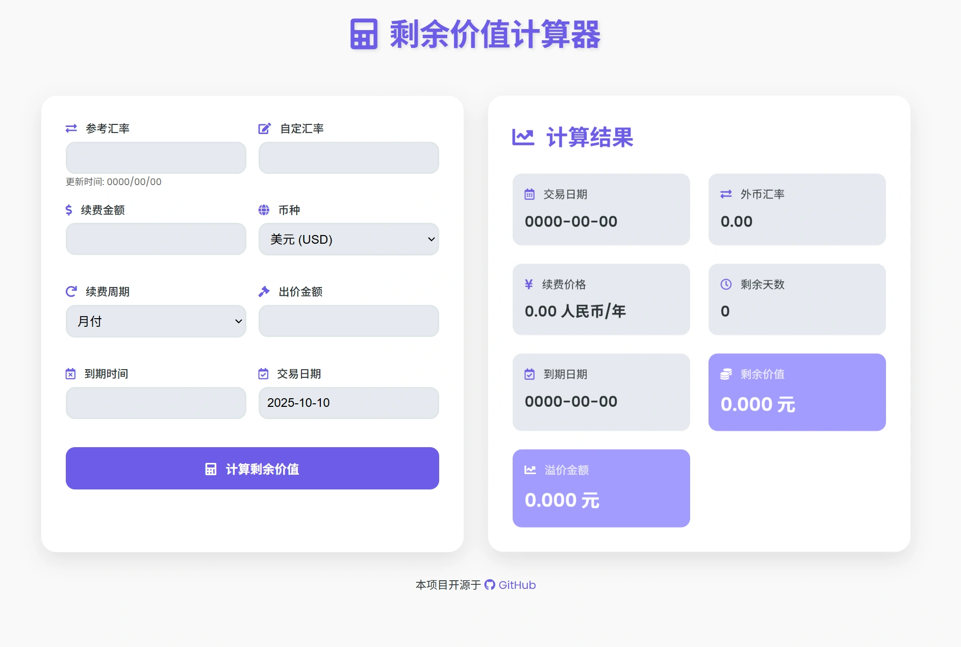 | 💵 精确估值 | 输入续费金额、汇率、周期、日期后,自动计算剩余价值(RMB) |