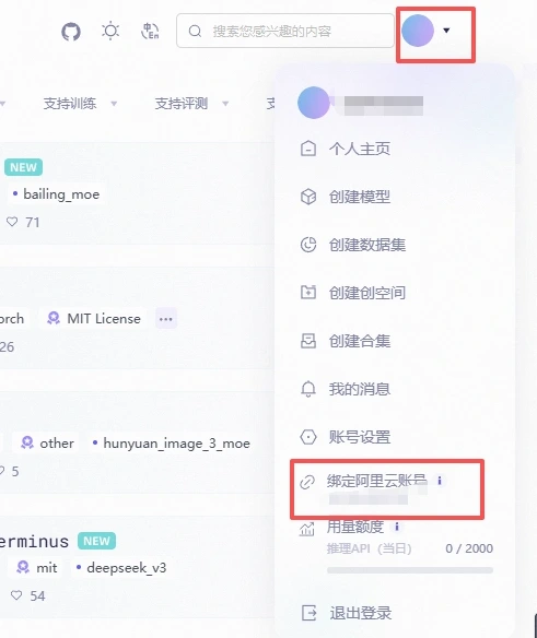 访问地址:https://www.modelscope.cn/ - 绑定阿里账号(前几天试过跳转阿里云之后登录点击绑定就行 不需要实名!!!)