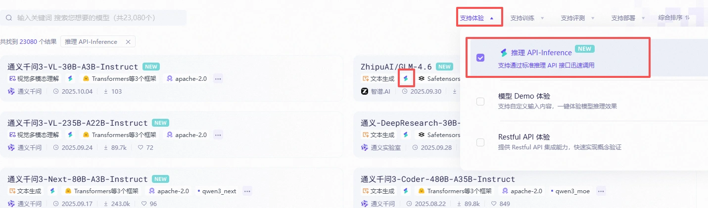 上图就是魔搭的模型库有闪电标志的就是能使用的