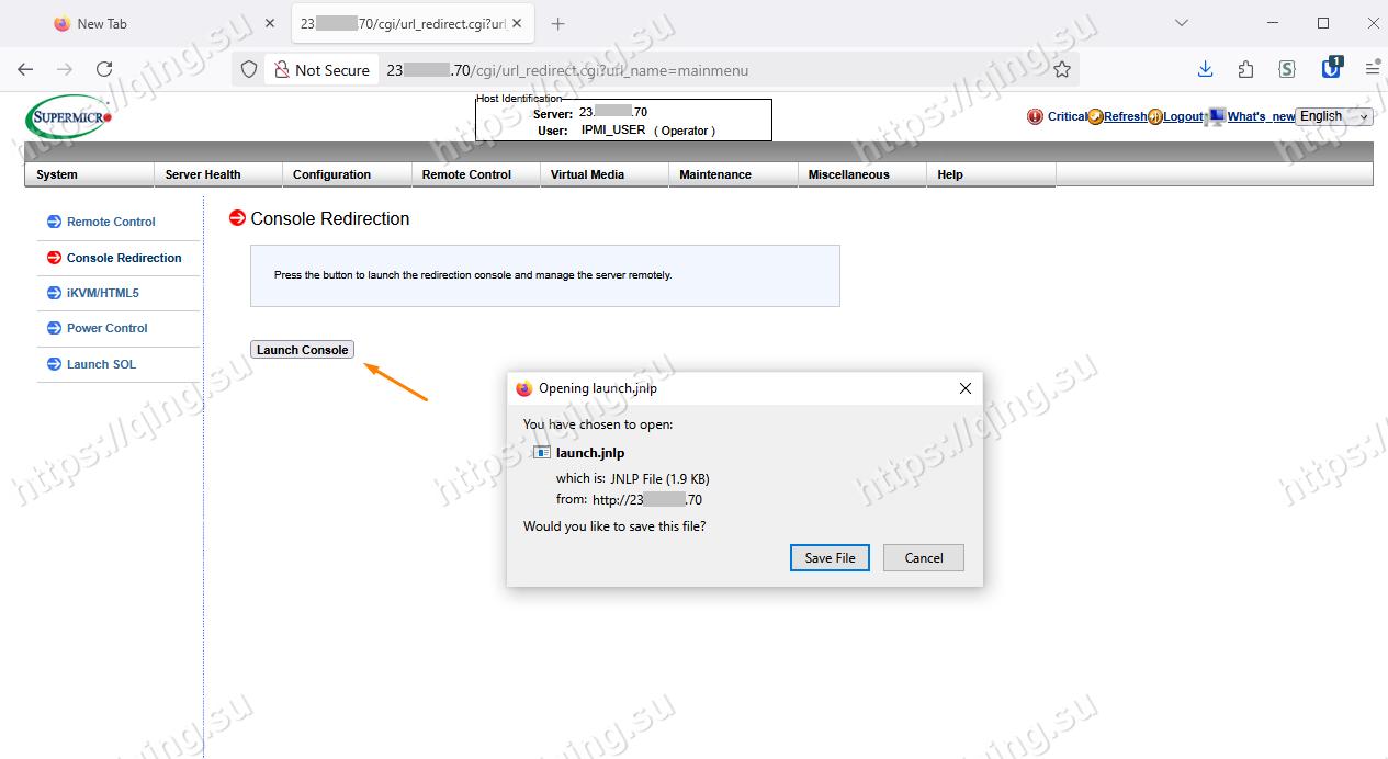 登录进去后,找到顶部 Remote Control, 然后点击Console Redirection – Launch Console, 即可下载IPMI的Java连接文件。将这个jnlp文件下载到本地后,双击即可连接IPMI iKVM终端(如果本地没有安装Java Runtime, 需要额外下载安装)。