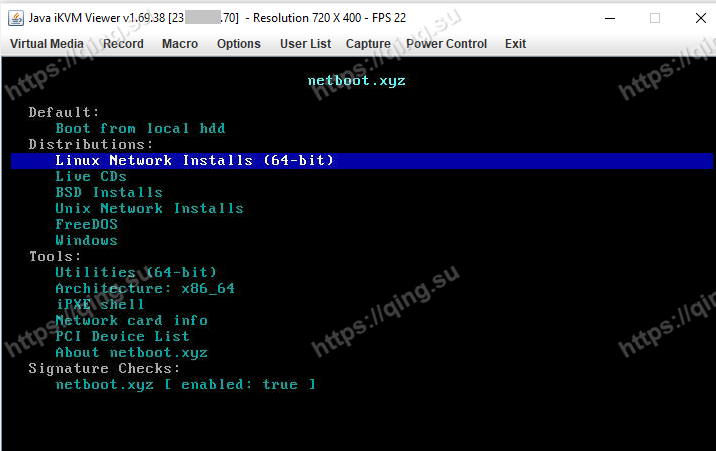 众所周知,IPMI中可以挂载本地操作系统镜像,然后一边上传一边安装操作系统。然而,由于操作系统镜像一般都很大(4 – 5 GB),使用这样的方式一般会需要2 – 3 小时。而netboot.xyz的镜像只有2 – 3 MB, 因此挂载和安装会非常方便快速。下面我就来具体介绍。