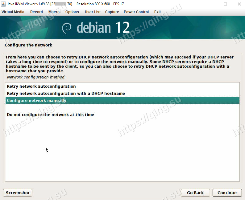 从挂载的 netboot.xyz.iso 镜像启动后,默认的DHCP网络配置可能会失败,导致无法进入操作系统安装界面。这里,我们需要手动配置服务器的网络。