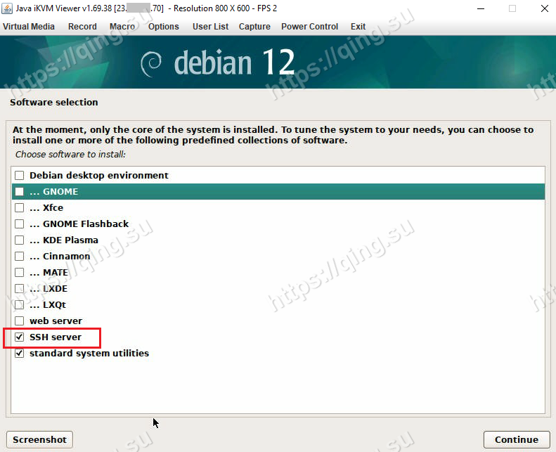 按照上一节的网络信息,依次输入服务器IP地址 (比如我这里是192.3.100.194), 子网掩码 (255.255.255.252), 网关地址 (192.3.100.193), DNS服务器地址 (8.8.8.8 8.8.4.4), 这样就配置好了网络。请跟随引导程序依次完成系统其他组件的配置和安装。请记得在软件包选项中选择安装SSH服务器,否则后面无法使用SSH登录。