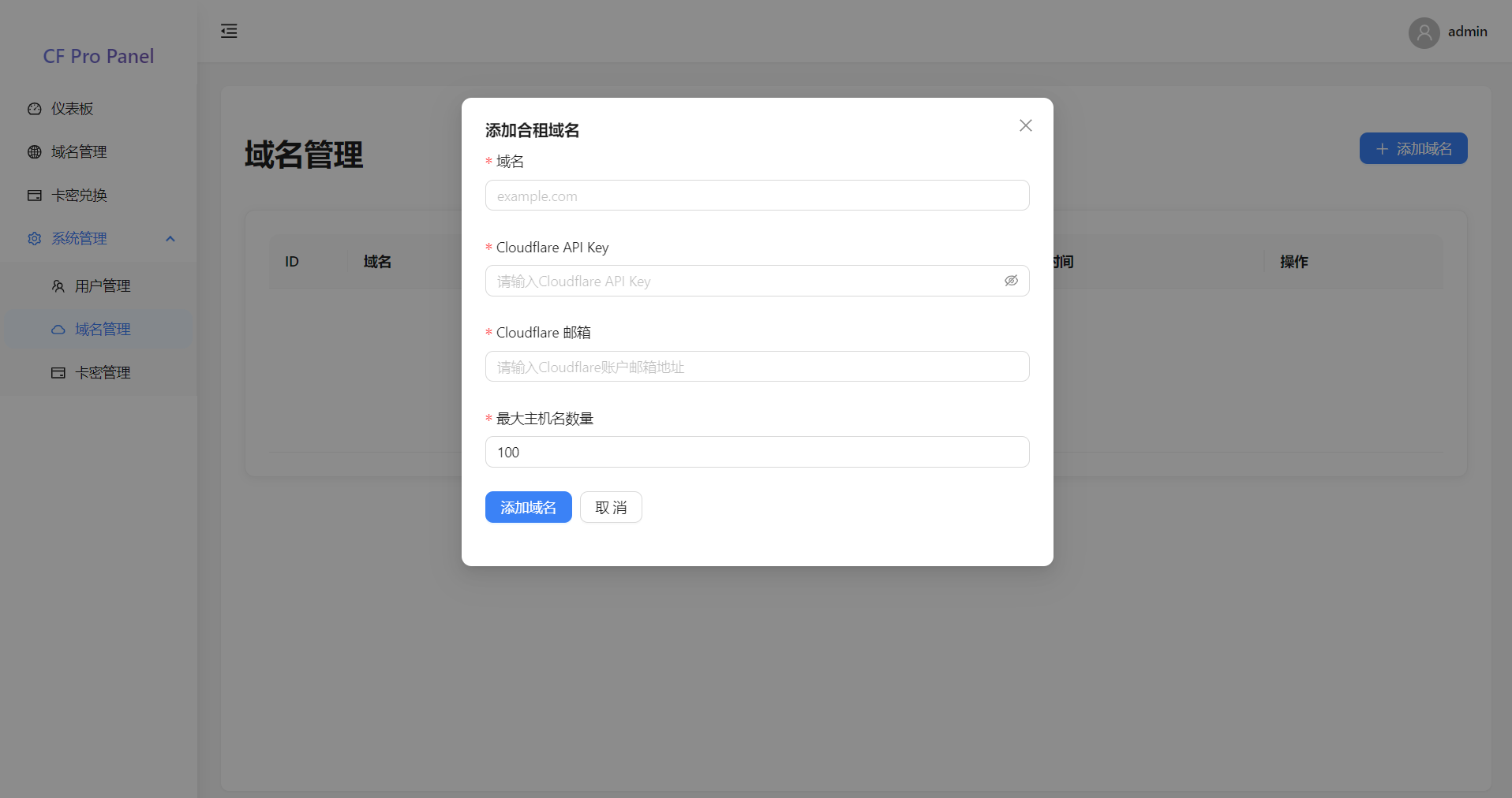 接下来在面板-系统管理-域名管理添加可用域名(用来开车的域名),此处的API KEY就是上面获取的Golbal KEY,由于CF有解析数量限制,所以可以设置最大主机名数量,当系统中最大主机名数量达到该数量后,用户新增时就不会显示这个域名了