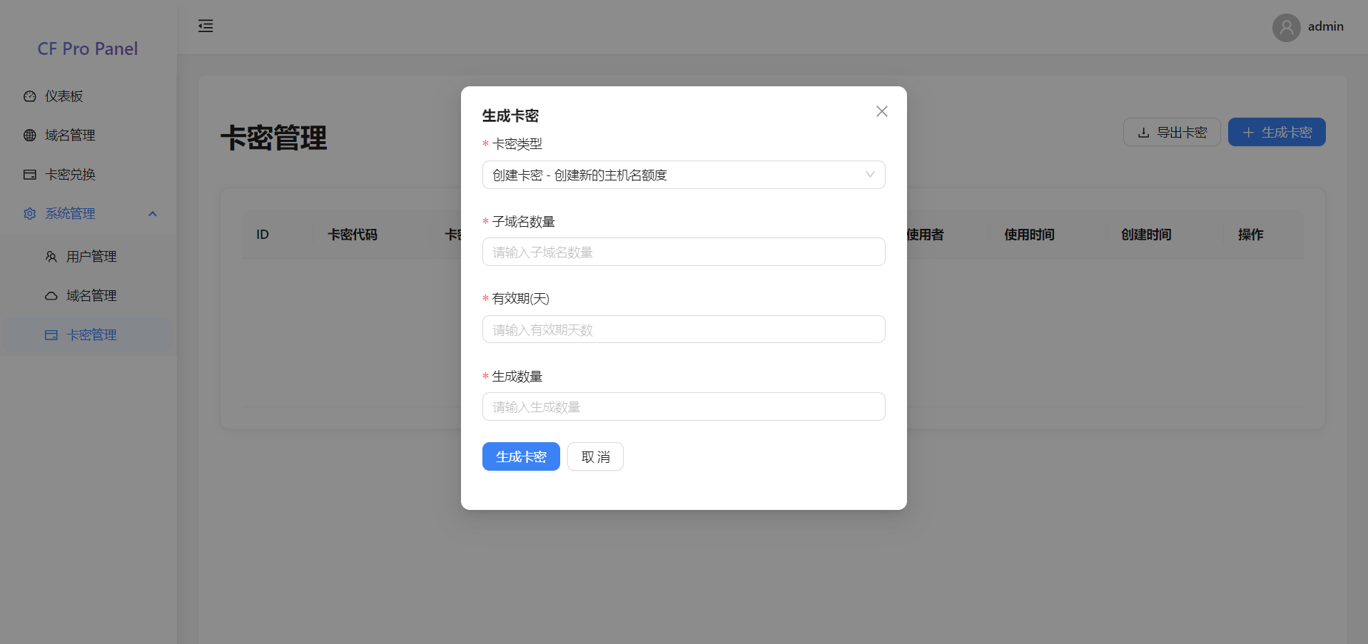 接下来是卡密生成和管理,卡密分为额度卡密和续期卡密两种,额度卡密用于创建额度,续期就不多说了