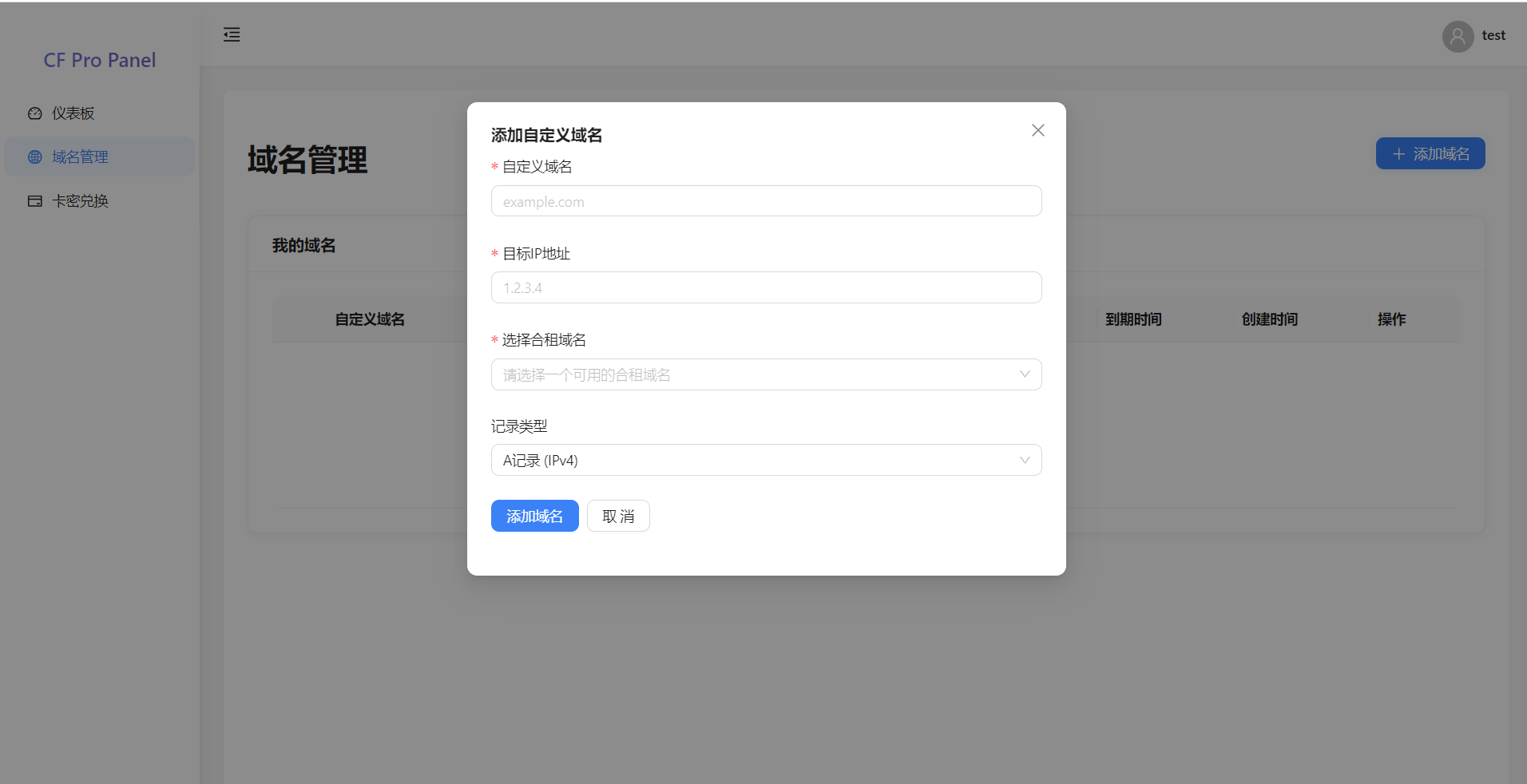 然后添加域名,注意我只测试了A记录,AAAA不保证可用,这里的目的IP就是用户的真实IP,自定义域名就是实际使用访问的域名