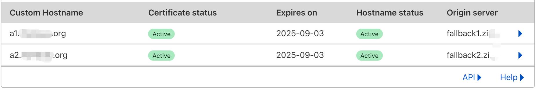 进入你的 CF 面板 (SSL/TLS -> Custom Hostnames),为每个业务域名添加 Custom Hostname (即 a1.test.org 和 a2.test.org)。