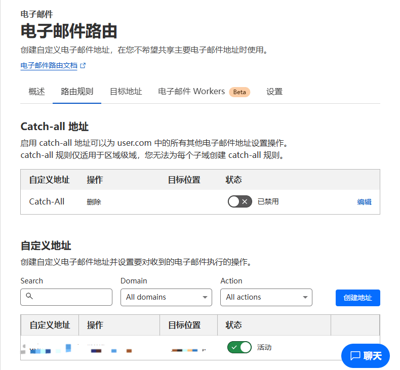 Cloudflare 支持 catch-all(泛收件)功能,但据说有 bug,可参考此修复脚本。