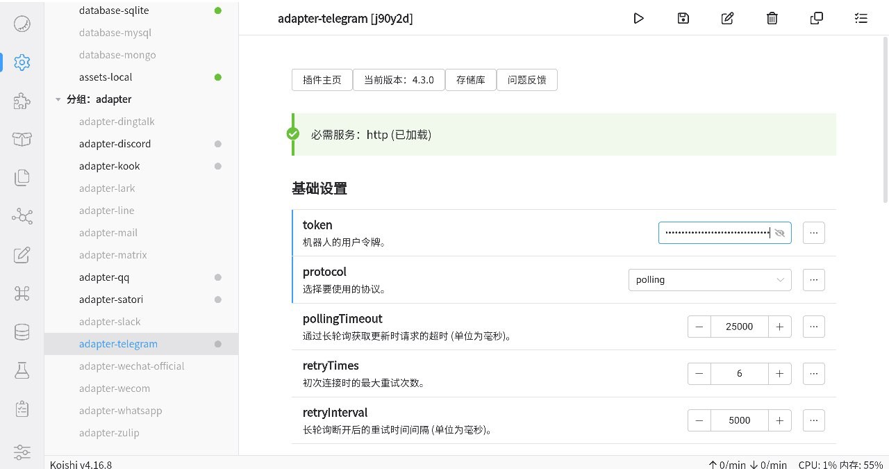 还是 Web 管理面板左侧第二个设置图标,找到 adapter-telegram,填入你的 Bot Token,协议类型选择 Polling 即可