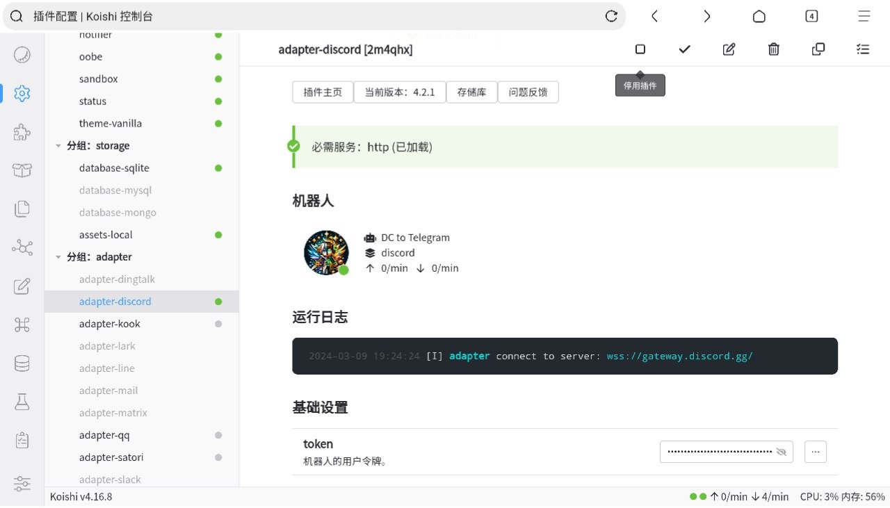 同界面下找到 adapter-discord,填写自己的 Discord API