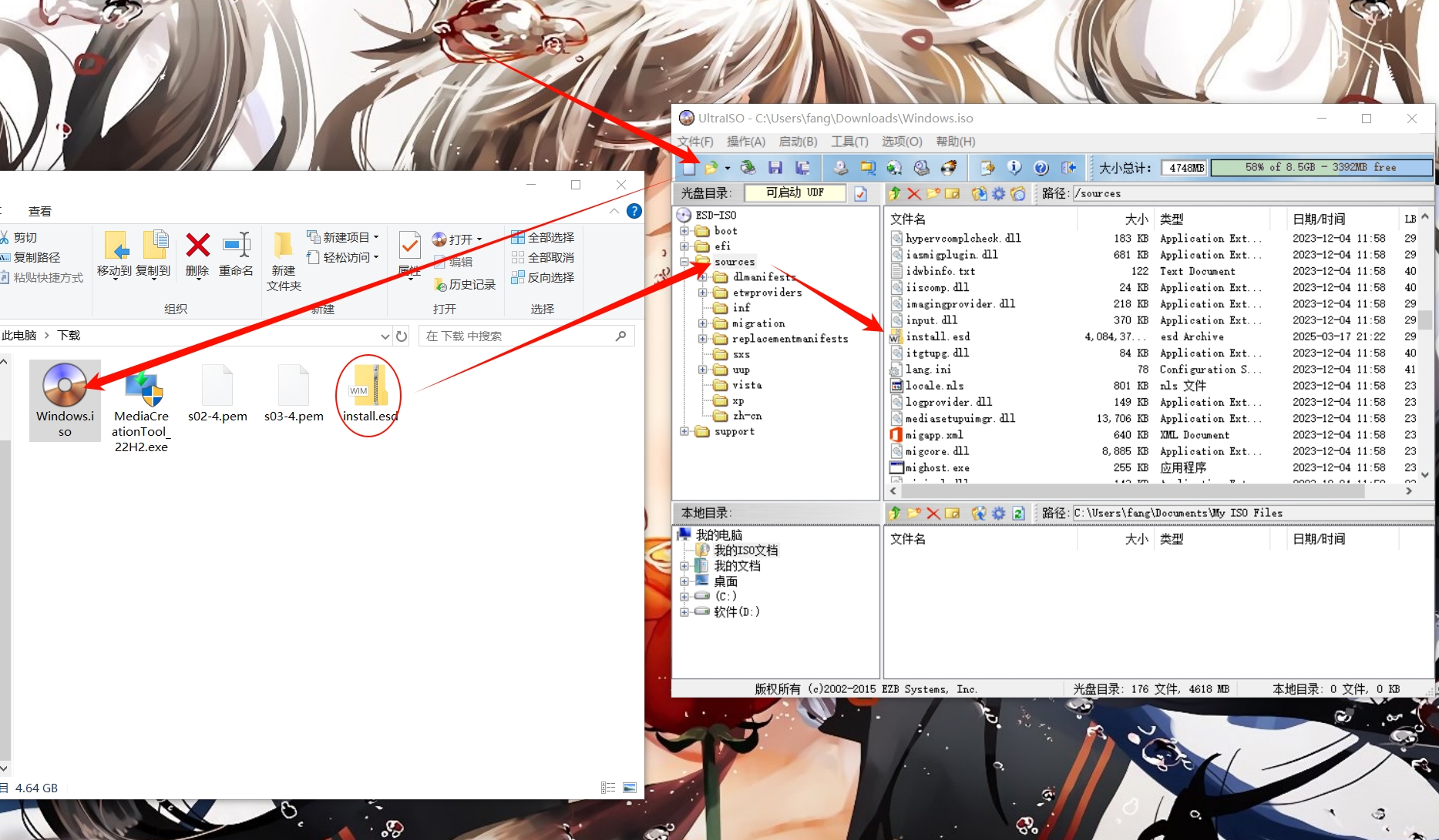 7:拿着这个install.esd文件到一台正常的电脑上,用管理员权限打开iso编辑器UltraISO,载入一开始的微软官方镜像文件iso,将这个install.esd替换掉sources文件夹里面的install.esd,然后另存为iso文件即可大功告成(注意另存为的时候不要去重命名,有概率导致软件卡死,保存完再改名字吧)