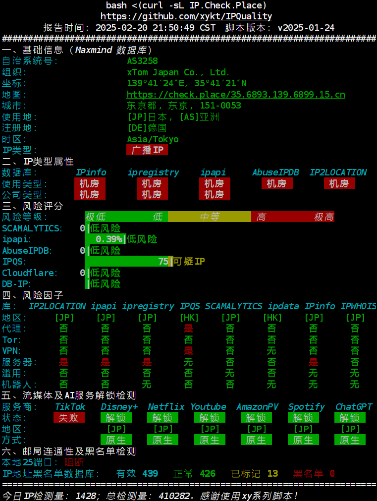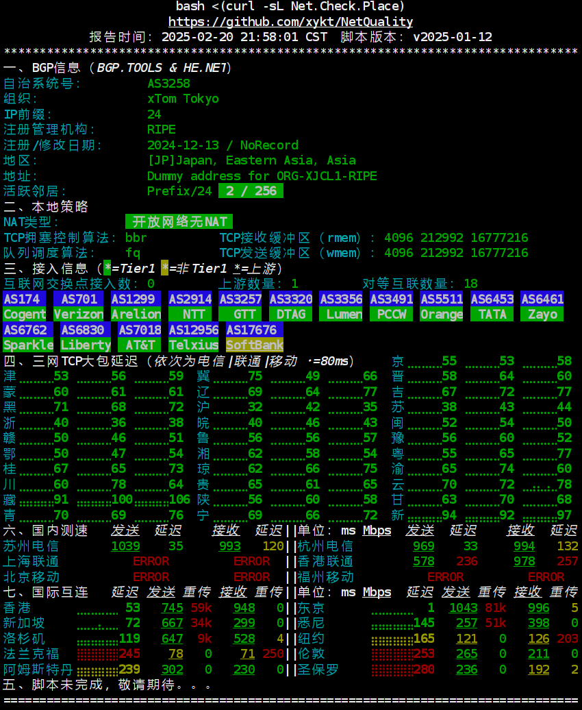 【晚高峰网络质量检测】V.PS新品Tokyo Gen 2(CN2GIA) 2025年2月20日 3条评论 9次阅读 0人点赞 Tao_Qi 结论 晚高峰整个大陆地区三网TCP全绿 电信稳定跑满千兆 除TK流媒体全原生解锁 网络质量体检(脚本未完成) IP质量体检 本作品采用 知识共享署名-相同方式共享 4.0 国际许可协议 进行许可 < 上一篇 下一篇 > Dandy说道: 2025年2月20日 下午11:08 好鸡 回复 freemjj说道: 2025年2月20日 下午11:10 三网TCP大包测试有意思 回复 xy说道: 2025年2月20日 下午11:18 @浅忆 #9 @奇迹 #10 @BlackSheep #11 感谢感谢 回复 发表回复 取消回复电子邮件地址不会被公开。必填项已用 * 标注* * *