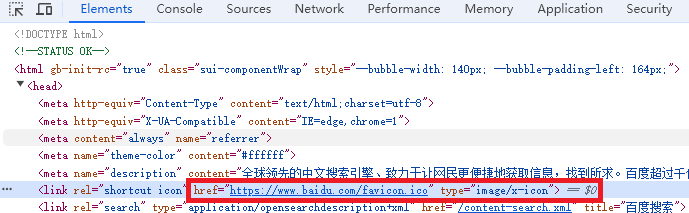 以百度为例,打开百度首页,找到并下载favicon.ico图标,如图: