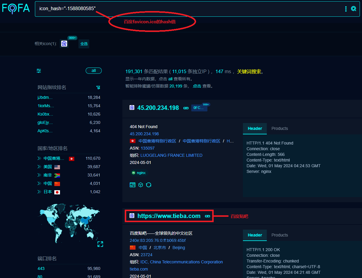 上传到FOFA中(需登录),这样就能获取到FOFA爬取的所有跟此favicon.ico图标hash值一样的网站,你能说这是百度留的后门吗,很明显就不是啊!下面是分析结果,如图: