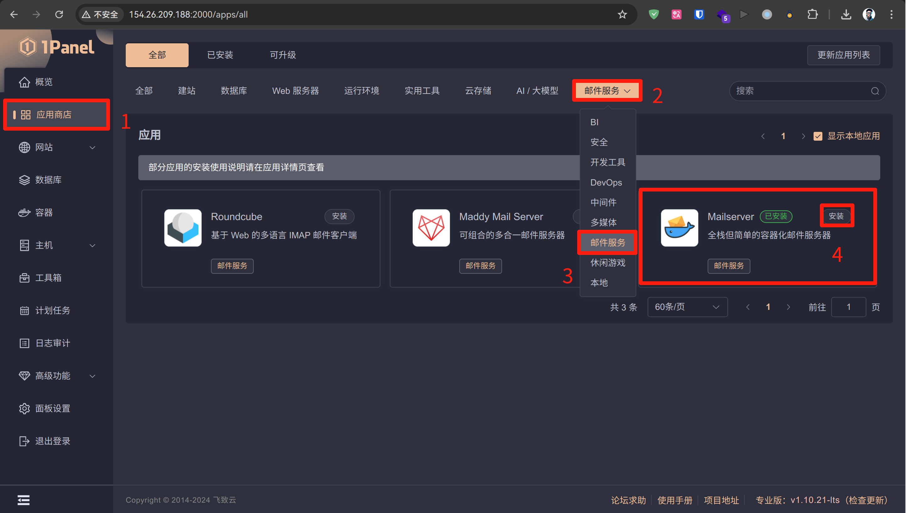 在 应用商店 中找到 邮件服务 分类,找到 Mailserver 点击 安装 :