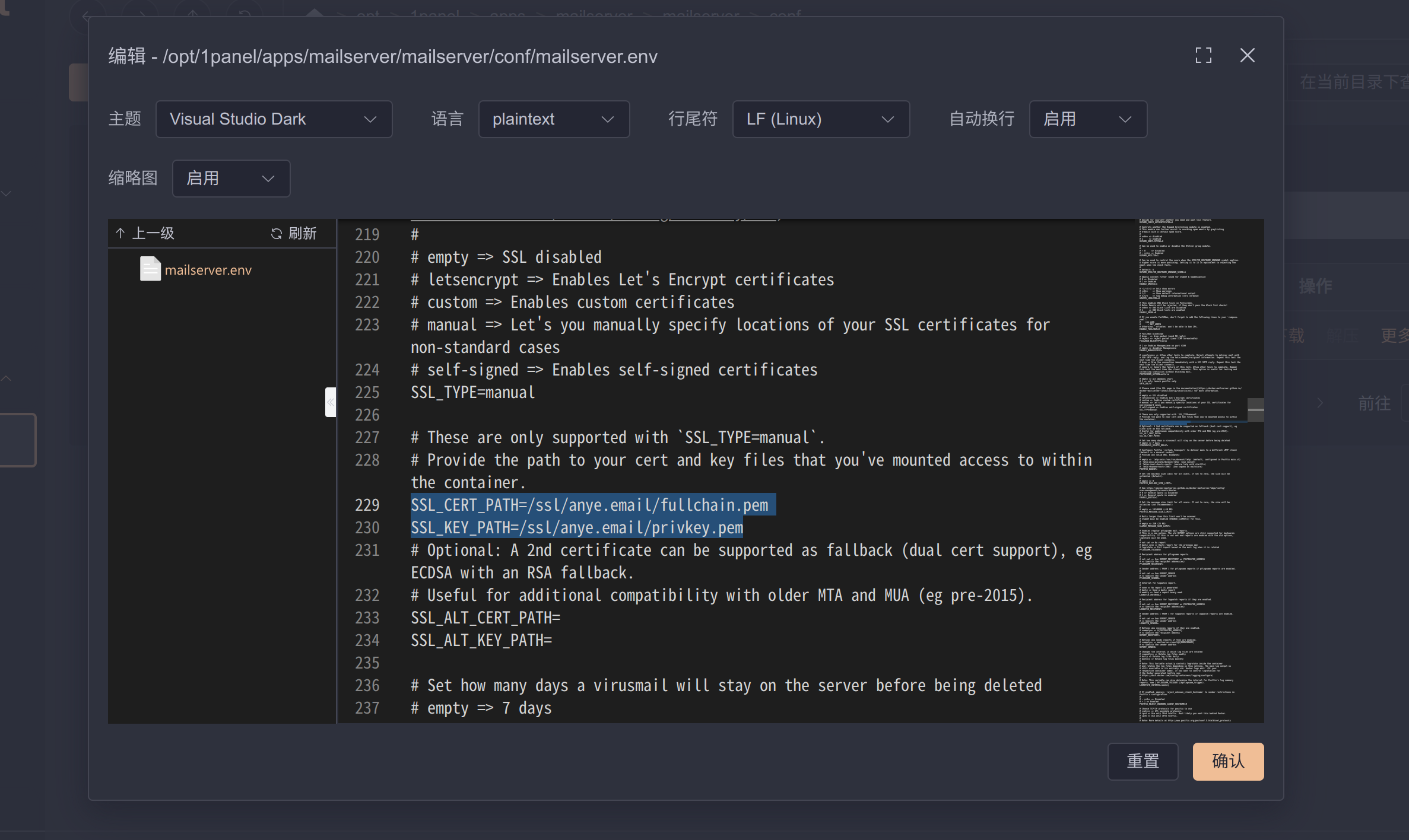 搜索找到 SSL_TYPE ,设定为 manual ,同时修改 SSL_CERT_PATH 和 SSL_KEY_PATH 为映射的 TLS 证书路径: