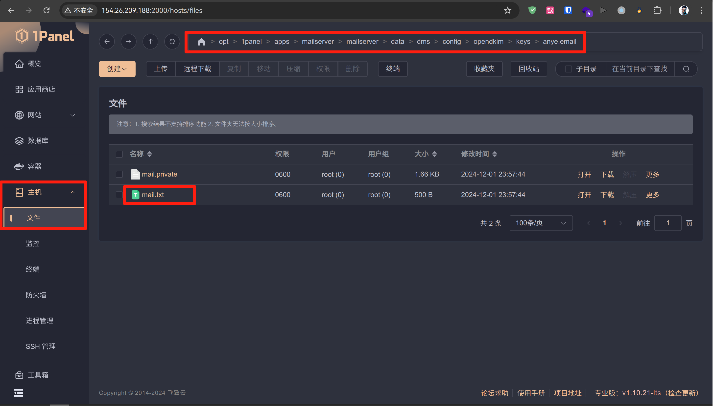 生成的 DKIM 在容器内 /tmp/docker-mailserver/opendkim/keys/ 目录下,即主机 /opt/1panel/apps/mailserver/mailserver/data/dms/config/opendkim/keys/ ,找到其中的 mail.txt ,下载,导入到 DNS 解析中,示例: