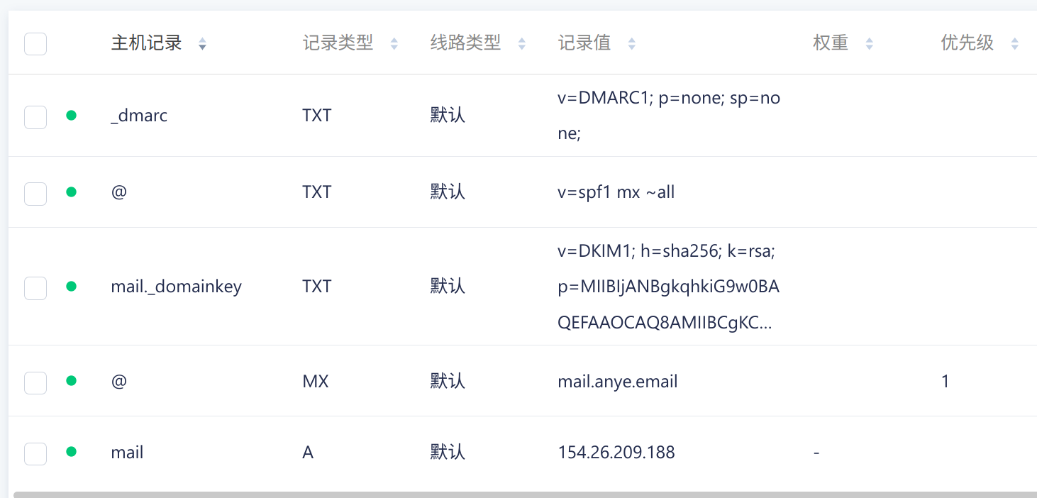 为了保证正常解析,mail.anye.email 需要一个对应的A记录(正好在配置中有对应的A记录:mail -> 154.26.209.188)。