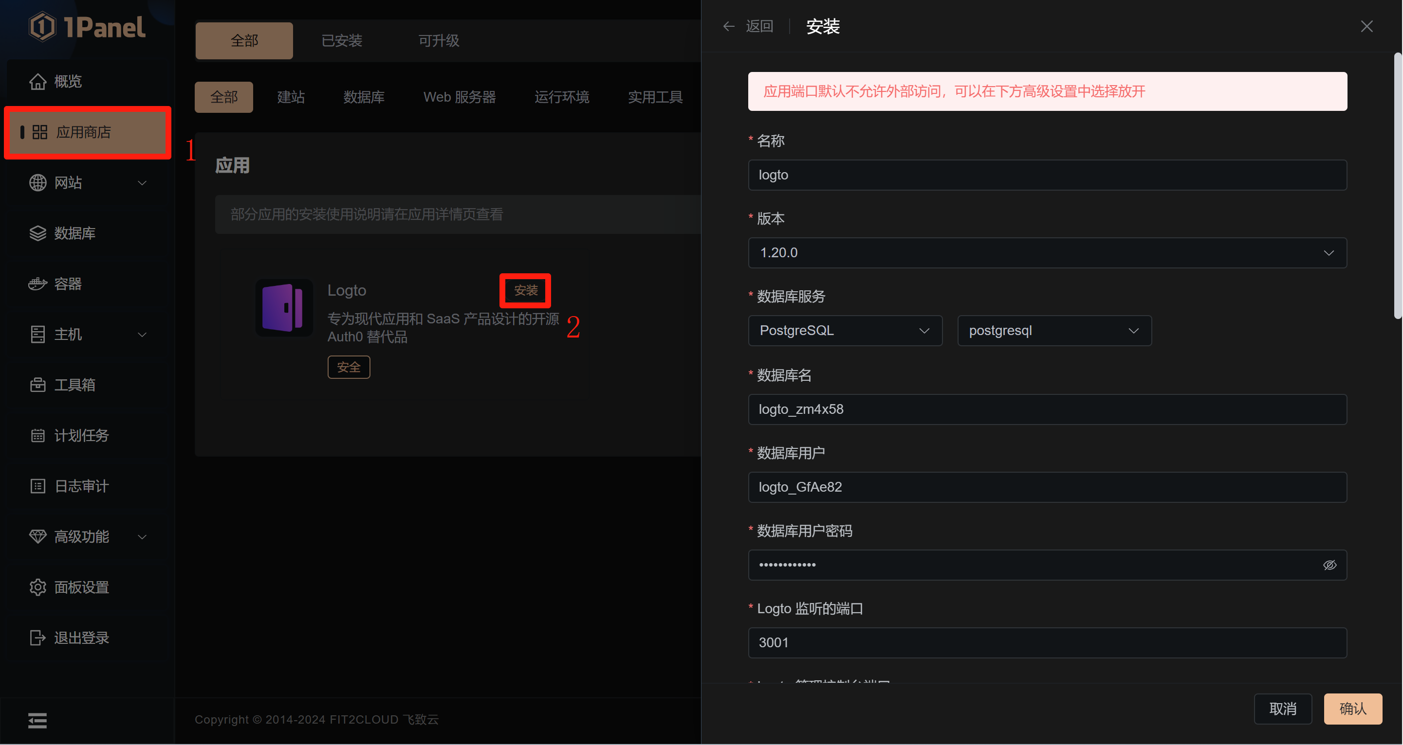 在 1Panel 面板中打开 应用商店 ,搜索 Logto ,点击安装。