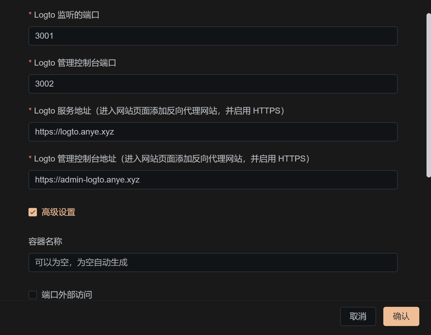 修改 Logto 服务地址 与 Logto 管理控制台地址 ,其余配置保持不变,点击 确认 开始安装。