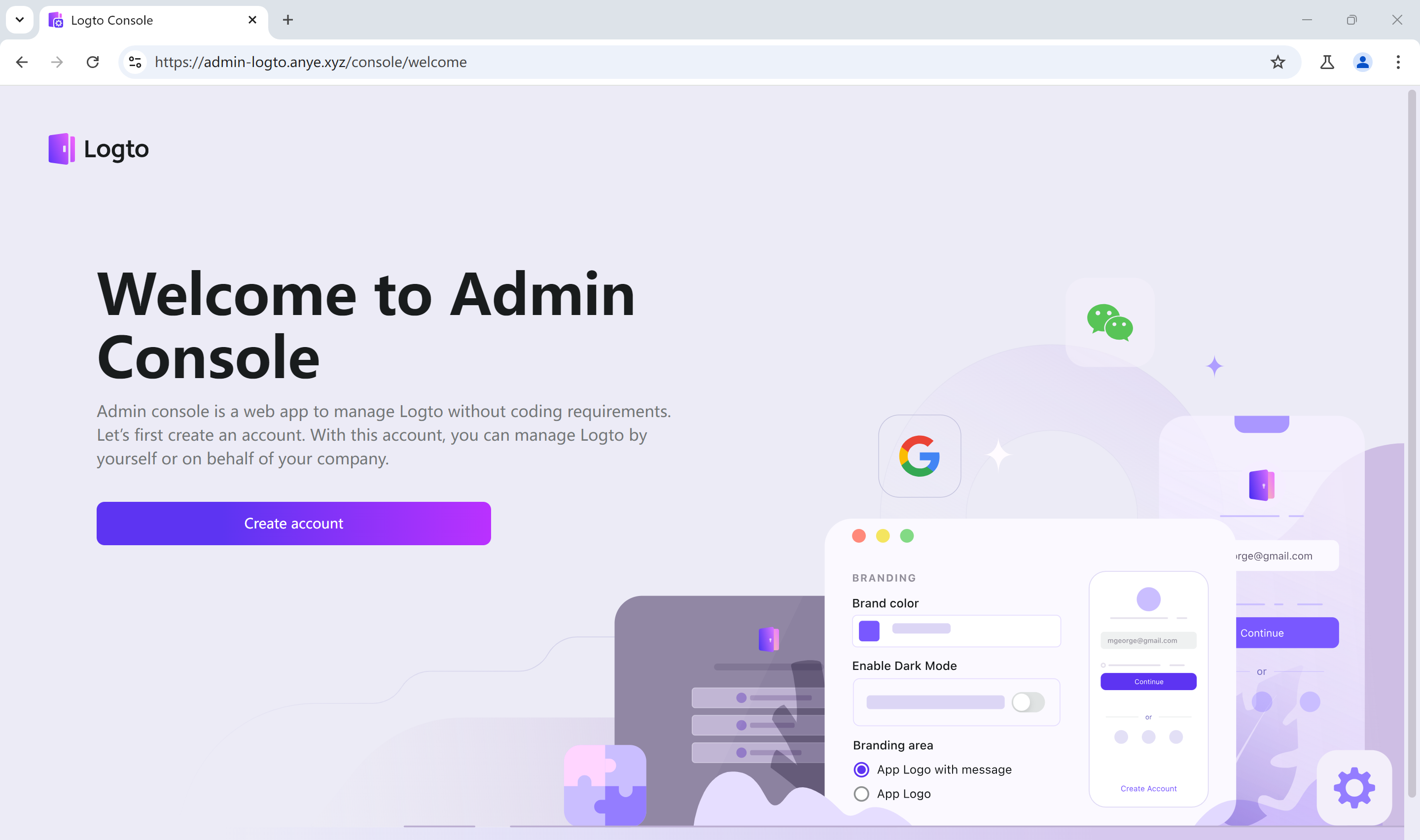 进入 Logto 管理控制台,如示例中 https://admin-logto.anye.xyz/ 即可进入欢迎页面,点击 Create account 按钮注册账户。