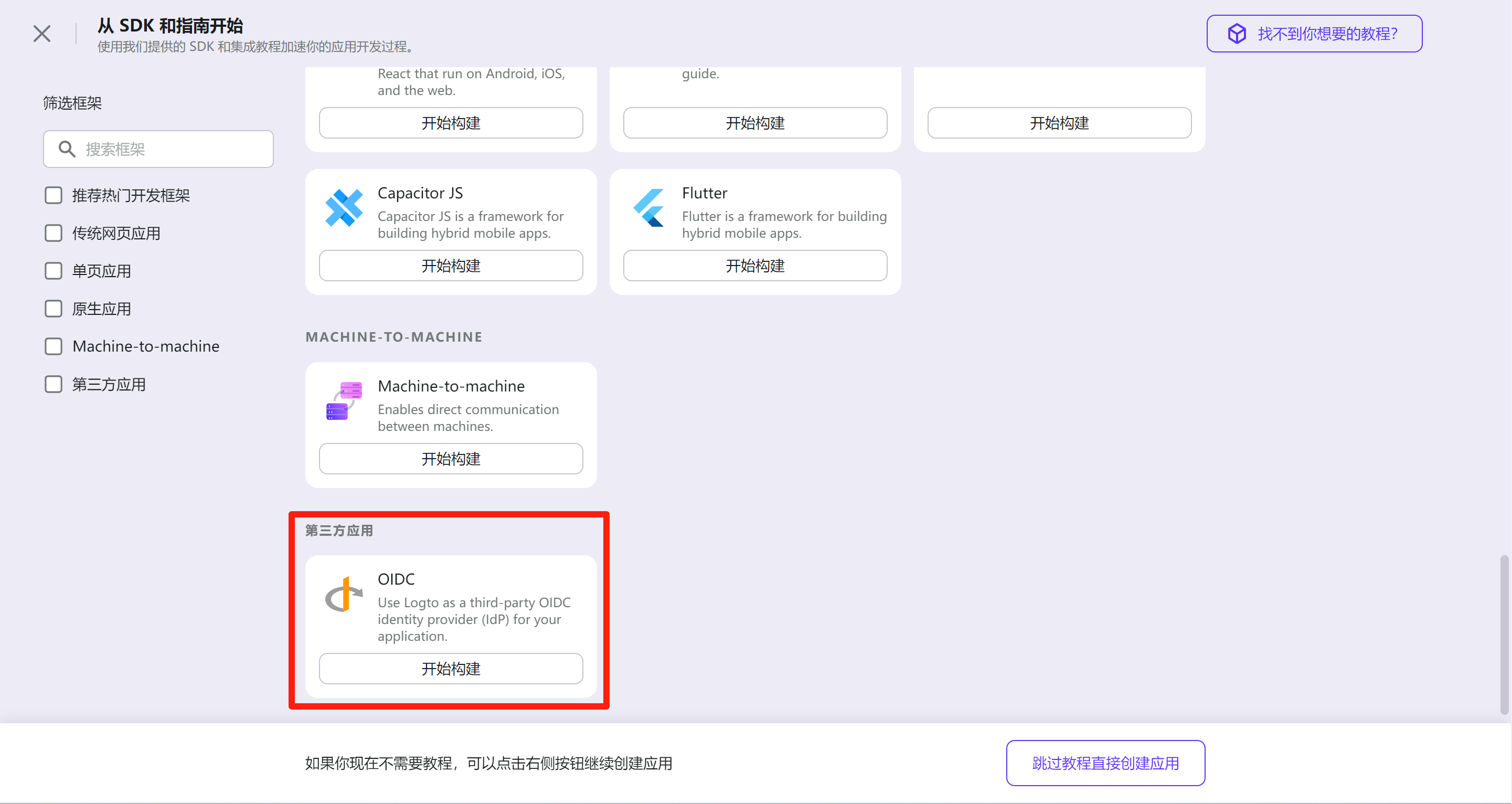 Logto 提供了丰富的模板,我们对接自己现有的应用时通常选用 OIDC,可以在 开始上手 - 查看全部 中的最下面找到。