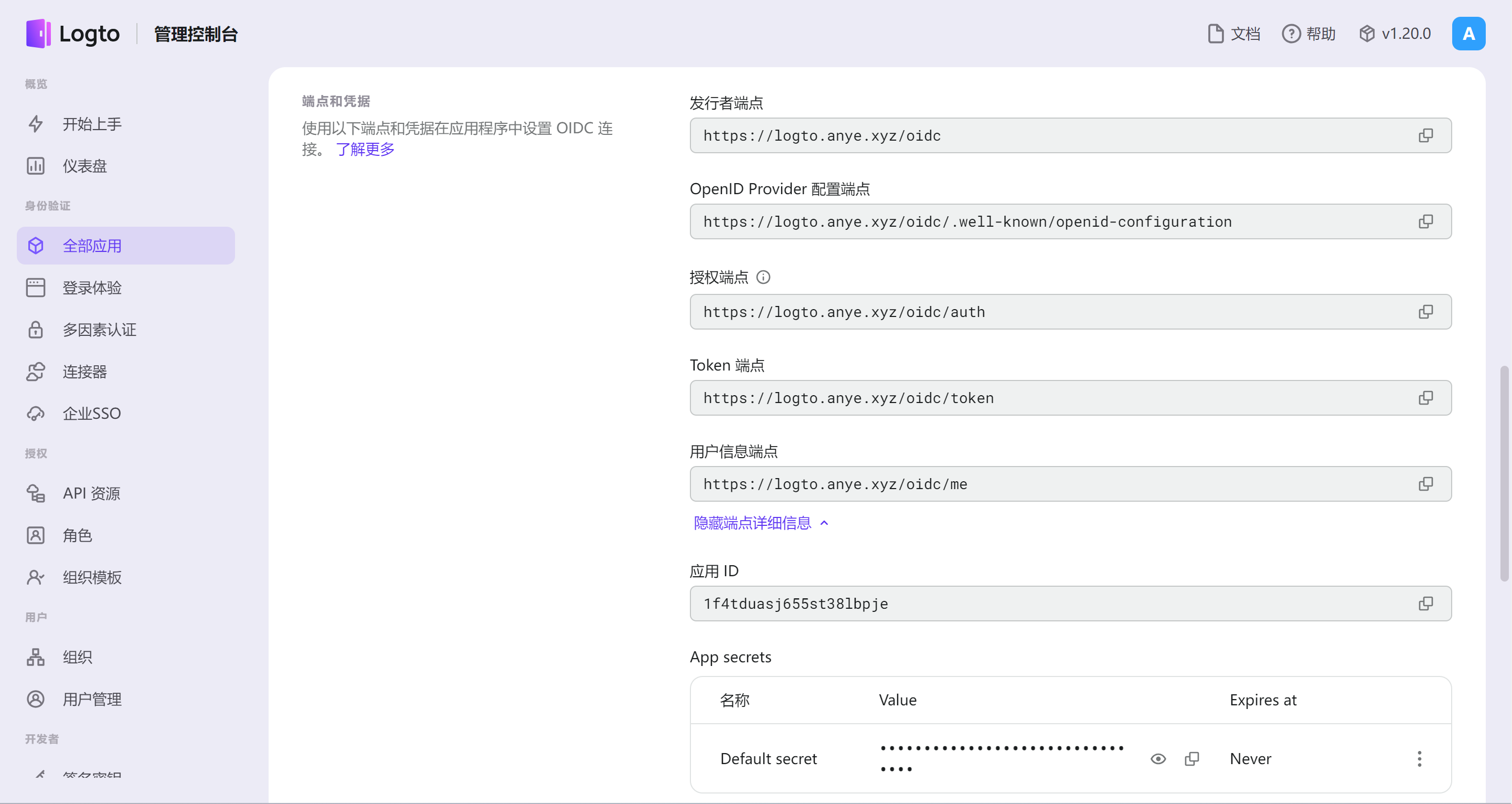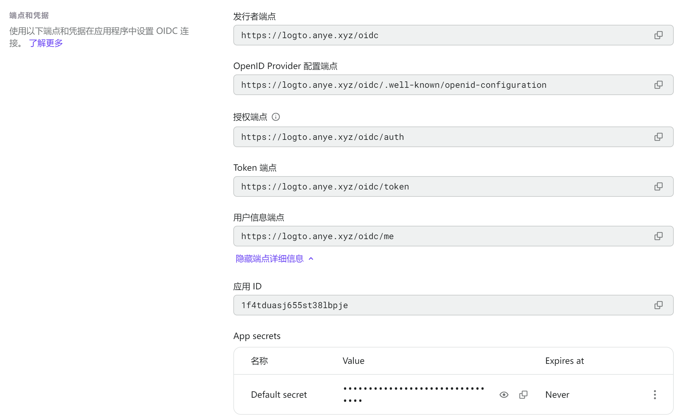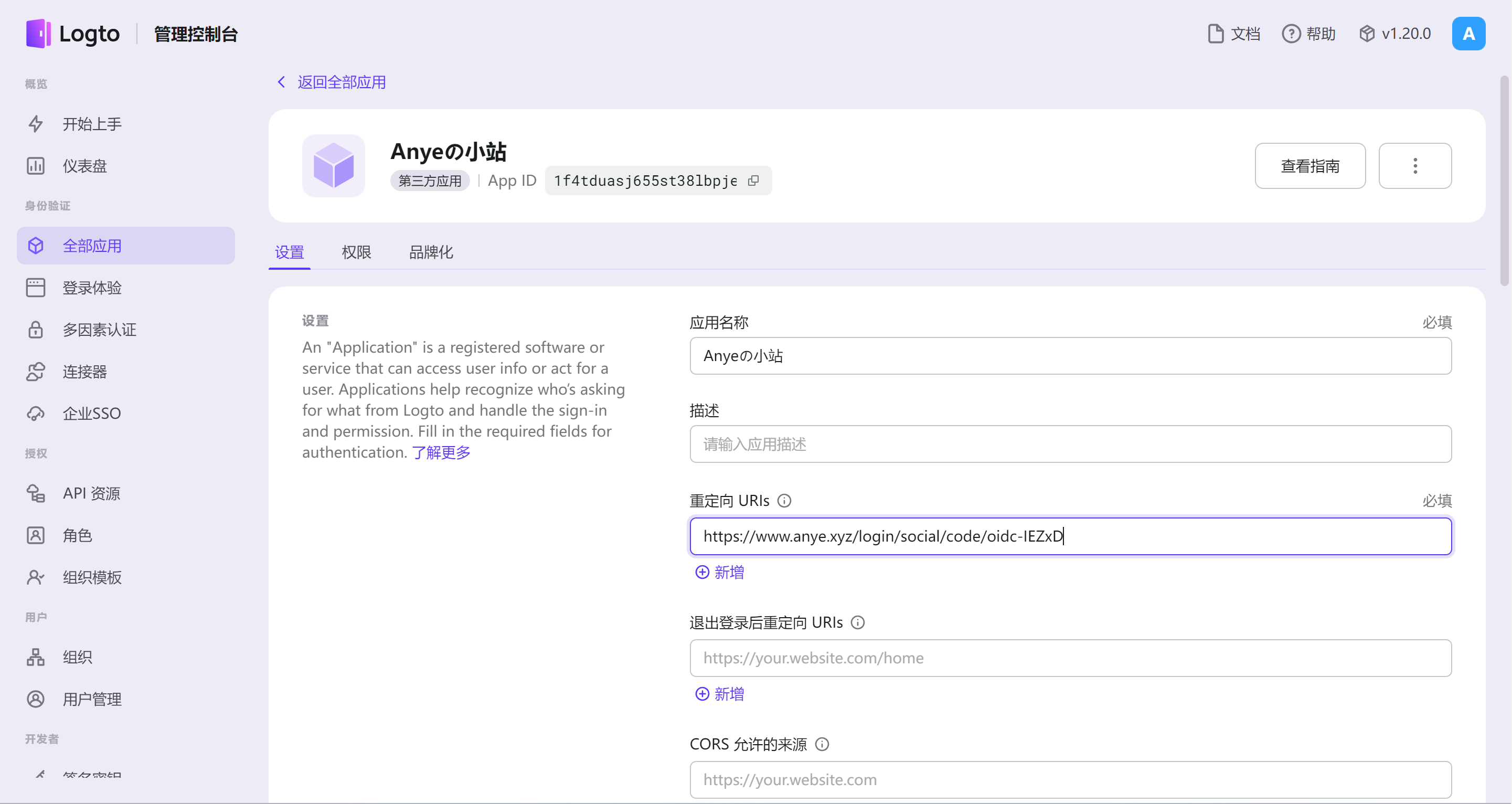 还没结束,别急着走掉🤣,在上图的 客户端 页面查看 回调地址 ,手动修改 {baseUrl} 为你的域名,填写到 Logto 应用设置的 重定向 URIs 字段中。