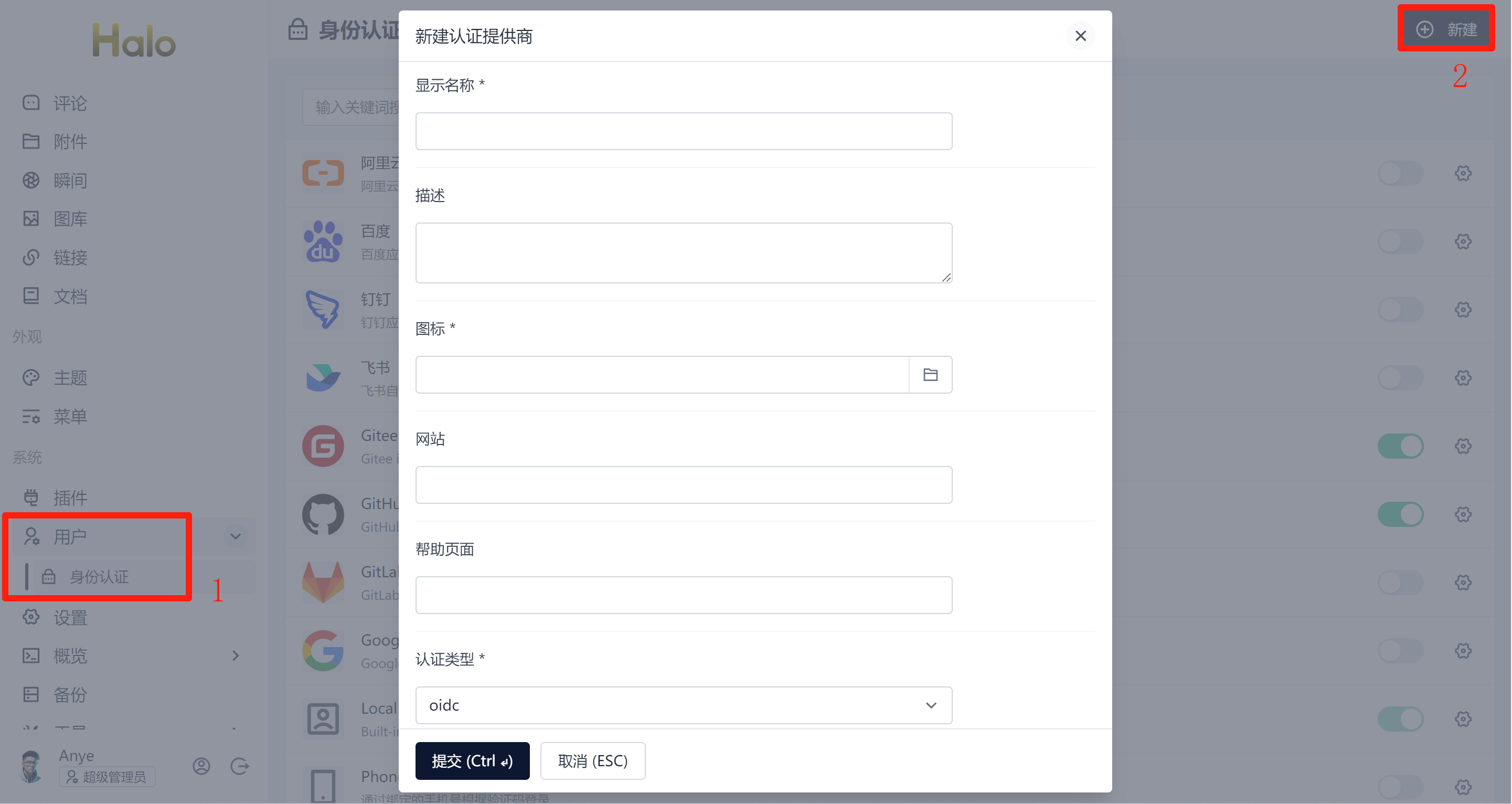 首先你需要在 Halo 中安装https://www.halo.run/store/apps/app-IXZkJ插件,接着在插件配置中 新建认证提供商