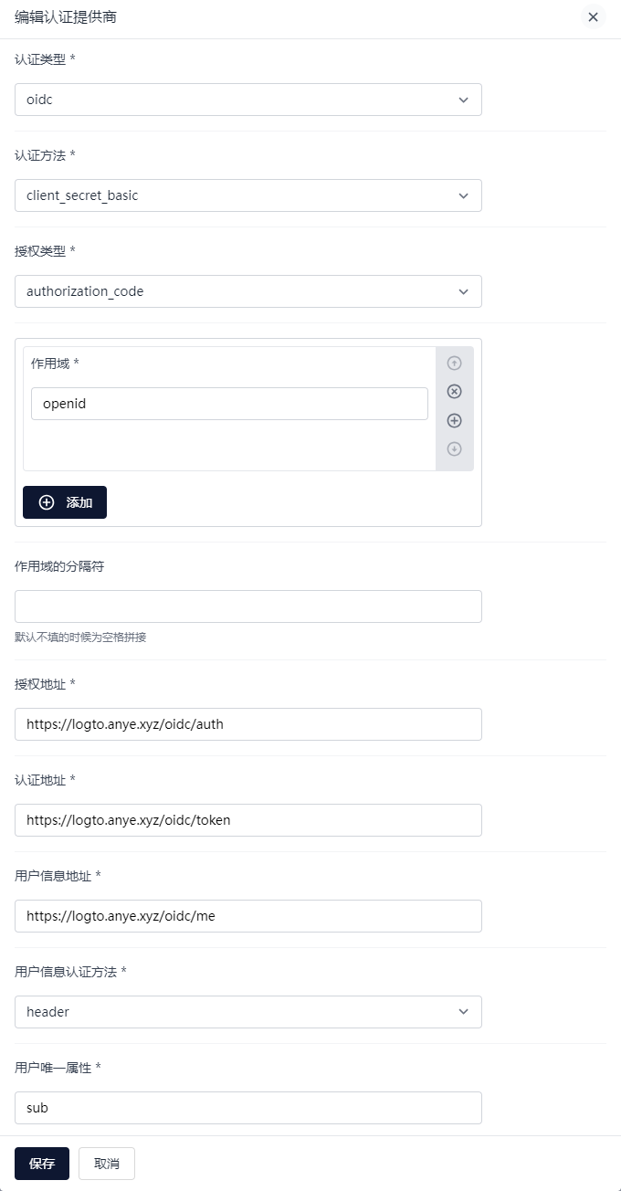 授权地址 填写 Logto 管理页面中的 授权端点 ,认证地址 填写 Token 端点 ,用户信息地址 填写 用户信息端点 ,用户唯一属性 填写 sub ,保存。