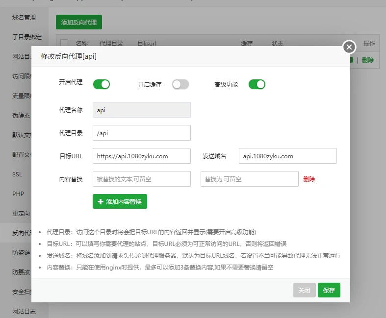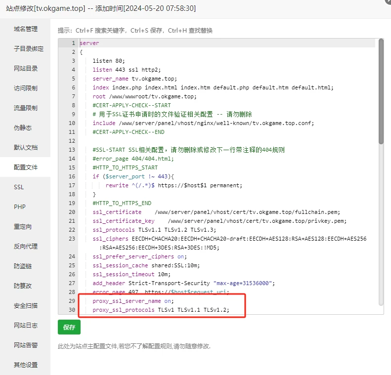 首先,宝塔的网站配置需要增加两行,否则代理接口会返回 502