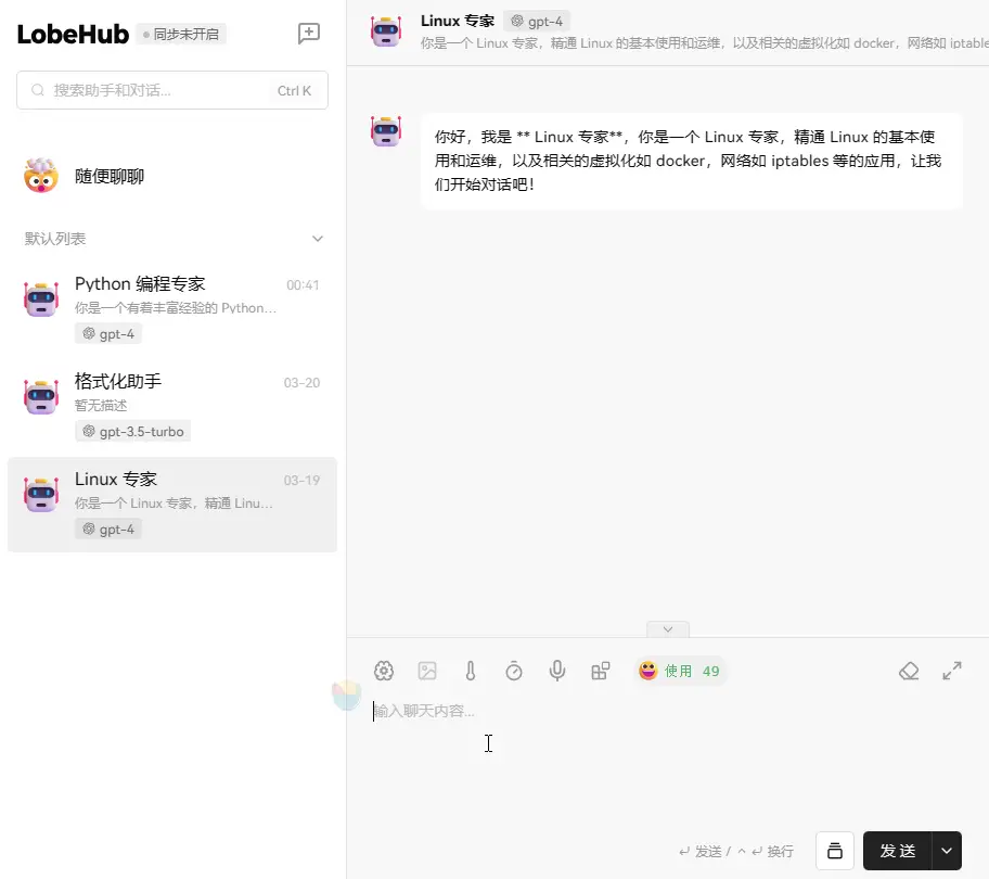- 使用,就是这轮对话使用的 token,图片显示 49 就是因为我为助手设定了引导词,每次对话都会发送。