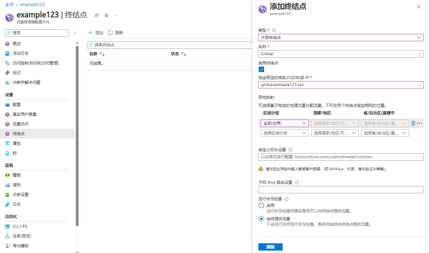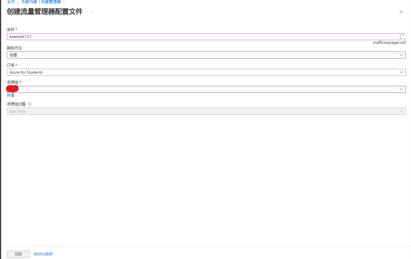 创建解析国内流量的终结点的方法也一样,只是这次域名或IP要换成你用来提供国内服务的服务器域名或者IP。区域分组和国家地区要选择亚洲和中国。然后点击创建。