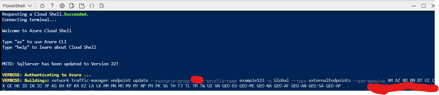 az network traffic-manager endpoint update --resource-group 你的资源组名字 --profile-name example123 -n Global --type externalEndpoints --geo-mapping AM AZ BD BN BT CC CX GE HK ID IN IO JP KG KH KP KR KZ LA LK MM MN MO MV MY NP PH PK SG TH TJ TL TM TW UZ VN GEO-EU GEO-ME GEO-NA GEO-AF GEO-AN GEO-SA GEO-AP