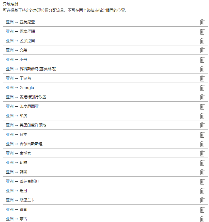 az network traffic-manager endpoint update --resource-group 你的资源组名字 --profile-name 你的流量管理器配置文件的名字 -n 你的全球流量终结点名字 --type externalEndpoints --geo-mapping AM AZ BD BN BT CC CX GE HK ID IN IO JP KG KH KP KR KZ LA LK MM MN MO MV MY NP PH PK SG TH TJ TL TM TW UZ VN GEO-EU GEO-ME GEO-NA GEO-AF GEO-AN GEO-SA GEO-AP