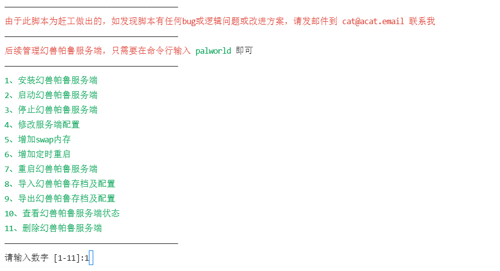 输入 1 安装幻兽帕鲁服务端
