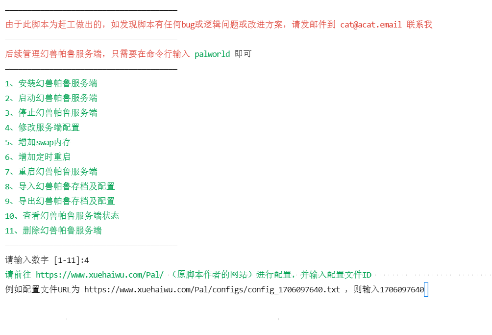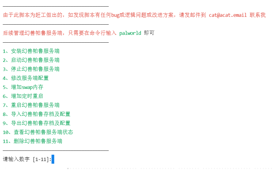 tips:第一次运行需要使用一键安装脚本,后续可以直接输入 palworld 进行管理