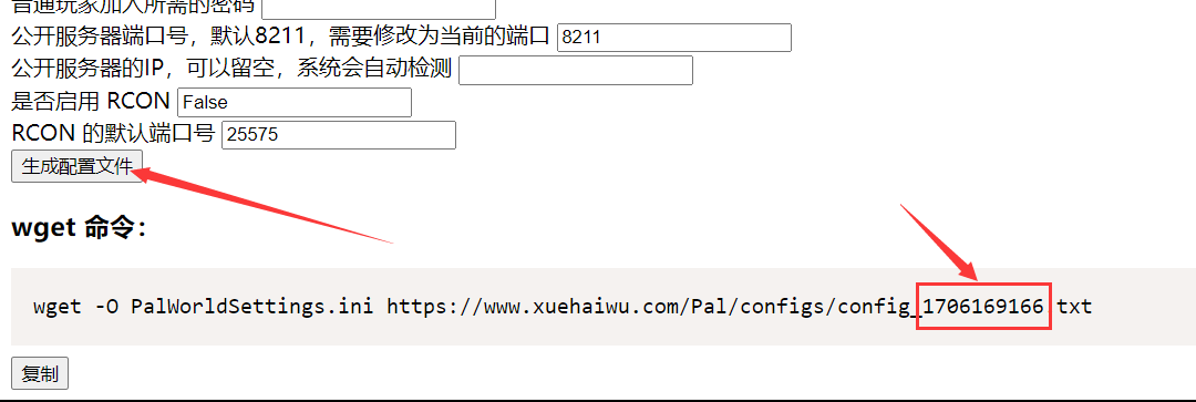 此时不要乱输入,先前往https://www.xuehaiwu.com/Pal/进行可视化配置,配置完成后点击页面最下方的 生成配置文件 并复制如图框选区域的 数字