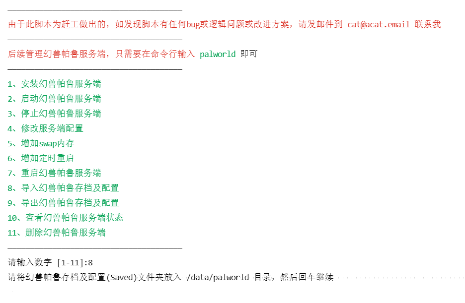 运行命令 palworld,输入数字 8 ,开始导入幻兽帕鲁存档及配置