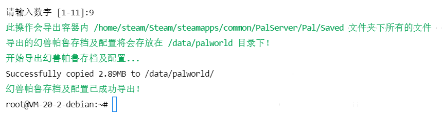 如果不是此脚本导出的话,Docker运行的请将容器内/home/steam/Steam/steamapps/common/PalServer/Pal/下的 Saved 文件夹导出放置在 /data/palworld/下,然后回车