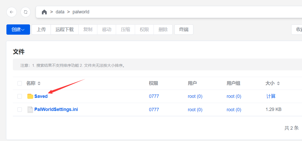 不到一秒钟就导出完成了,导出的存档文件夹为位于/data/palworld/下的Saved 文件夹