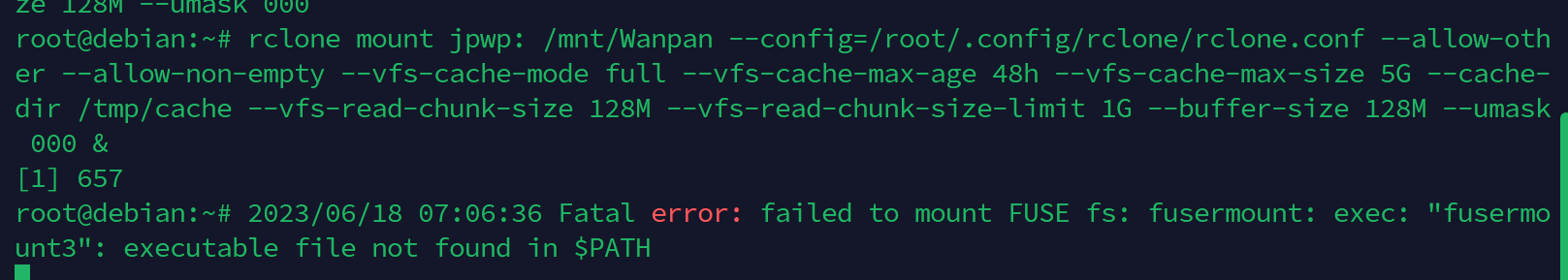 rclone mount jpwp: /mnt/Wanpan --config=/root/.config/rclone/rclone.conf --allow-other --allow-non-empty --vfs-cache-mode full --vfs-cache-max-age 48h --vfs-cache-max-size 5G --cache-dir /tmp/cache --vfs-read-chunk-size 128M --vfs-read-chunk-size-limit 1G --buffer-size 128M --umask 000 &