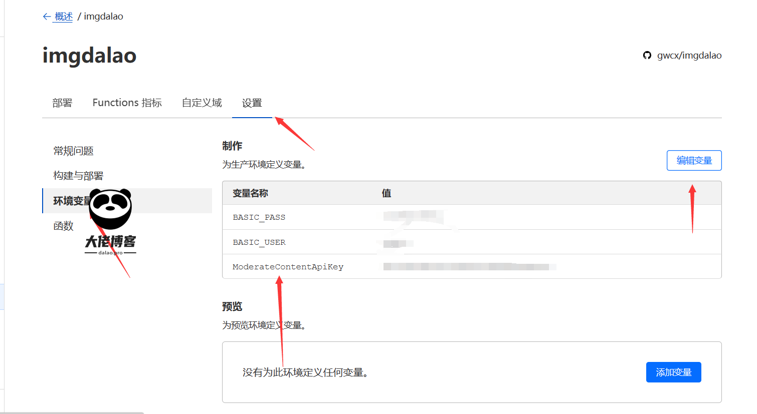 2、后台管理页面新增登录验证功能,默认也是关闭的,如需开启请部署完成后前往后台依次点击设置->环境变量->为生产环境定义变量->编辑变量 添加如下表格所示的变量即可开启登录验证