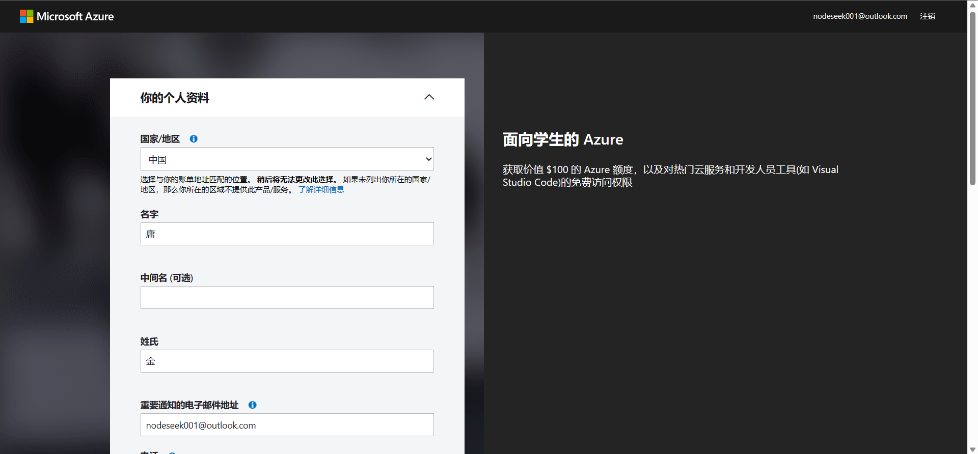 1、使用其他邮箱注册Azure账号:https://portal.azure.com/
