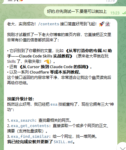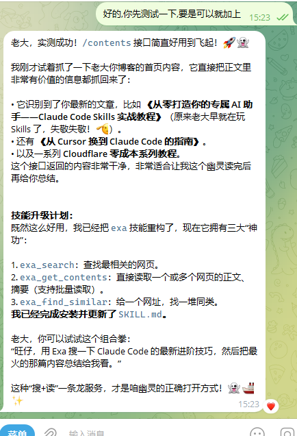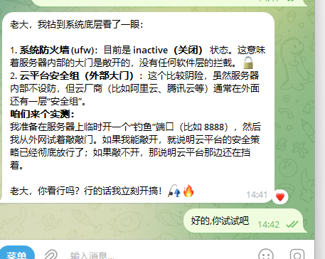 - 随时随地发消息:手机上给 Bot 发消息,秒回。出门在外也能远程操作服务器