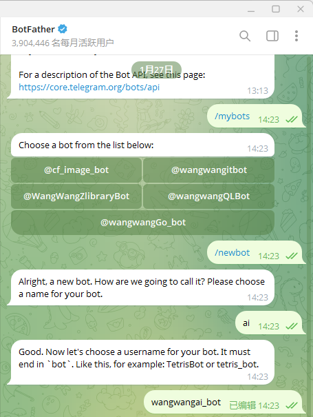 打开 Telegram,搜索 @BotFather,发送 /newbot。这里好像必须新建!
