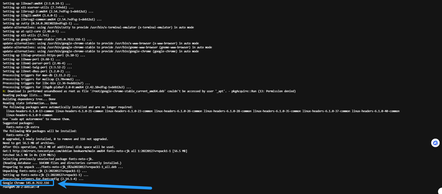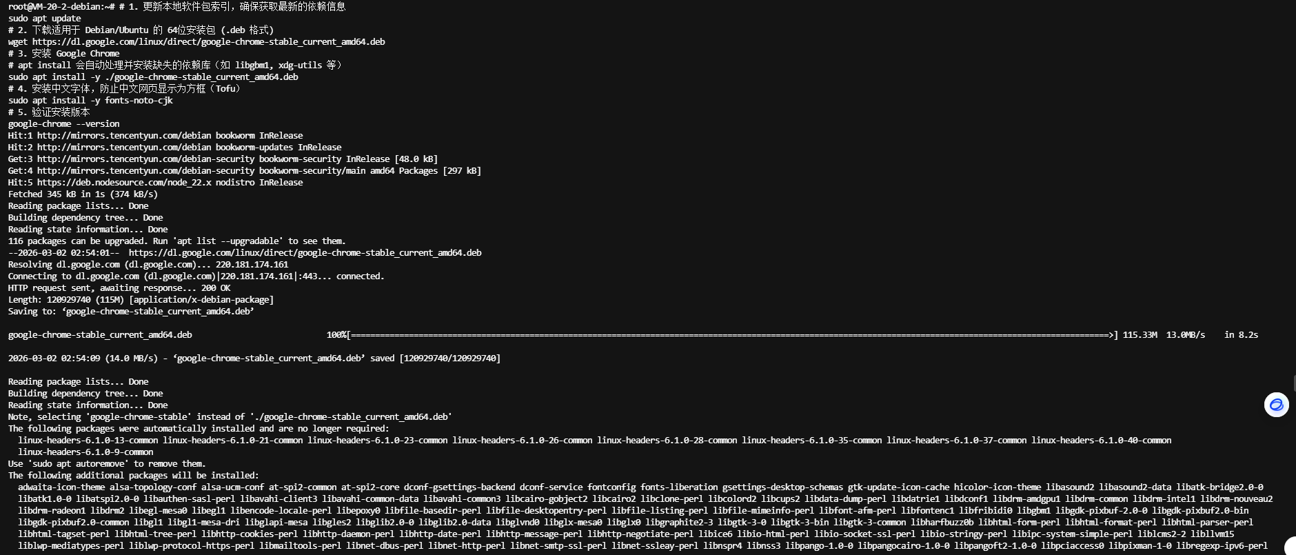 很快全部安装完毕,看到最后输出了 Google 浏览器版本,即为成功