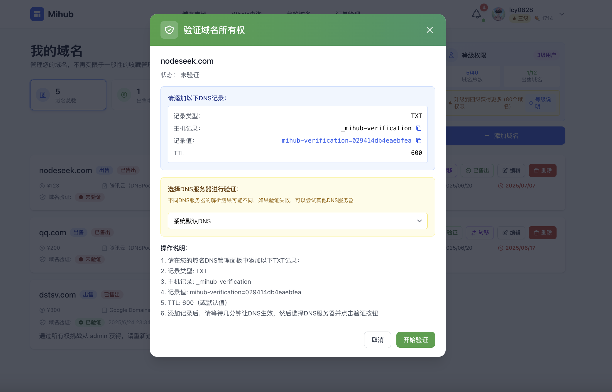 - 验证所有权:通过 DNS TXT 记录验证域名所有权